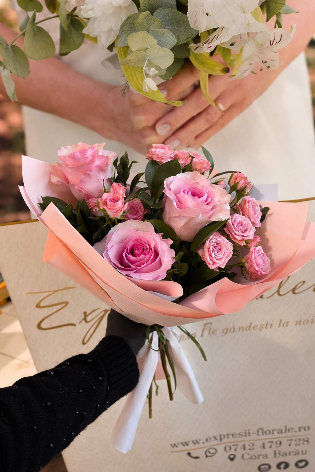 - Poza prezintă un aranjament floral real, așa cum a fost realizat și livrat la comanda unui client Expresii Florale.